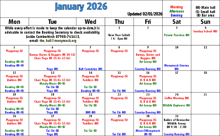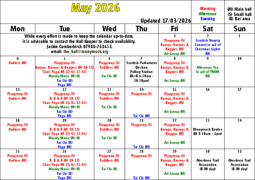 Monymusk Village Hall is a Charity registered in Scotland as Monymusk Village Hall Management Committee - SC038241